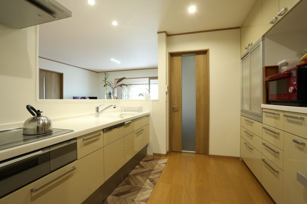 壁付けキッチンを、家族が顔を合わせて会話ができる対面キッチンに。