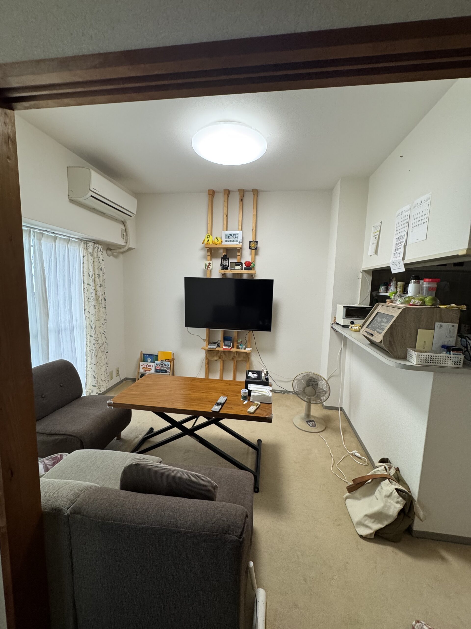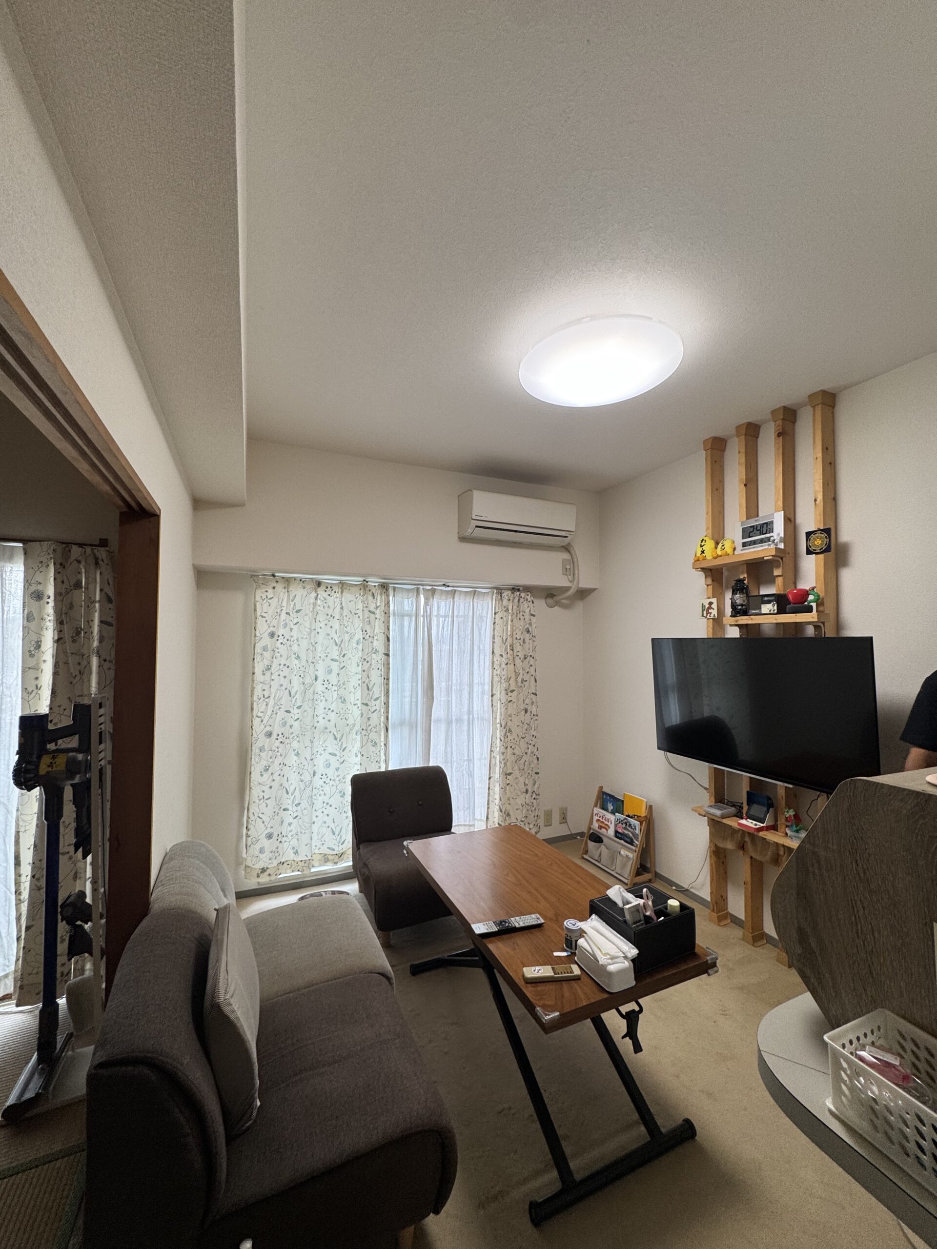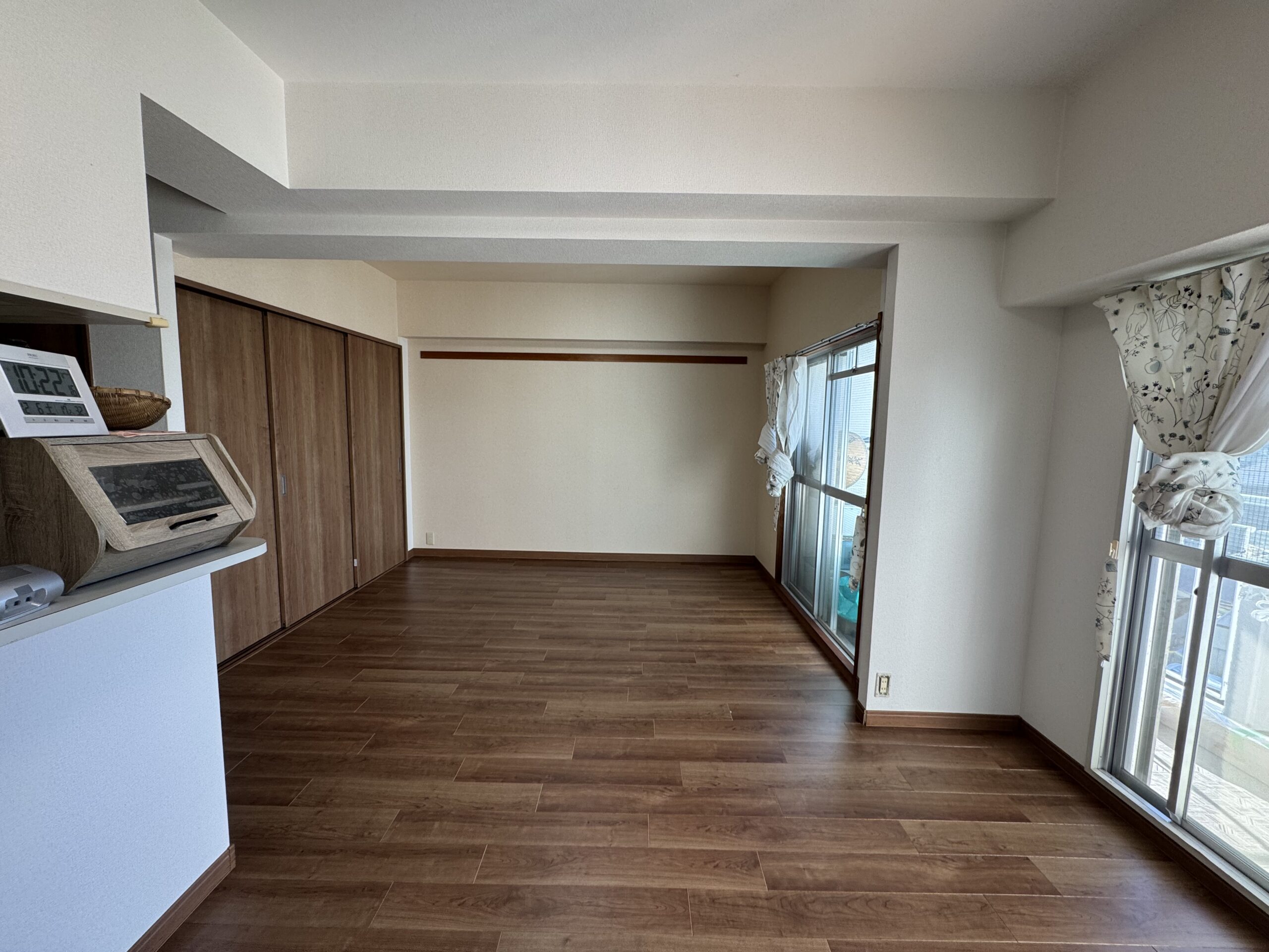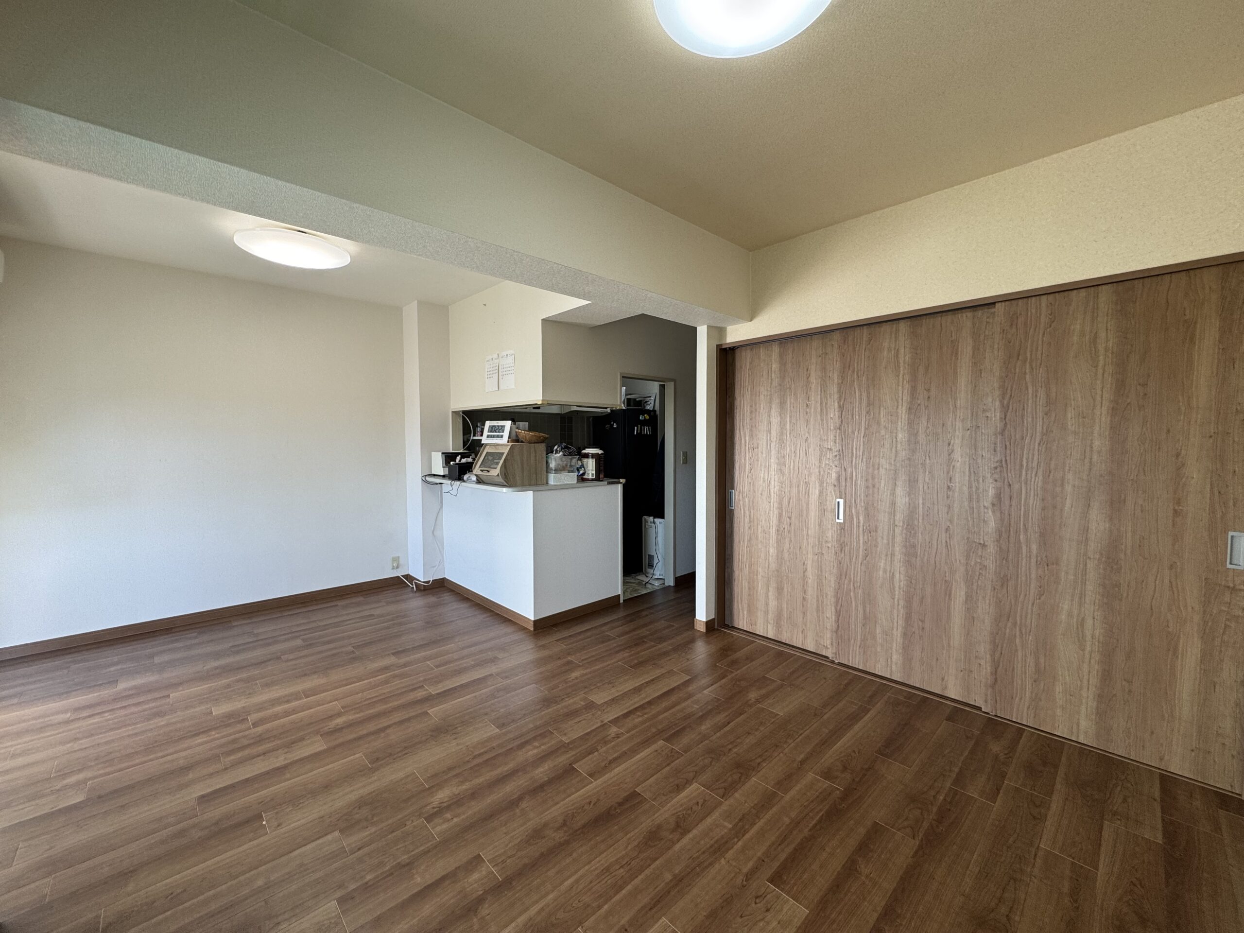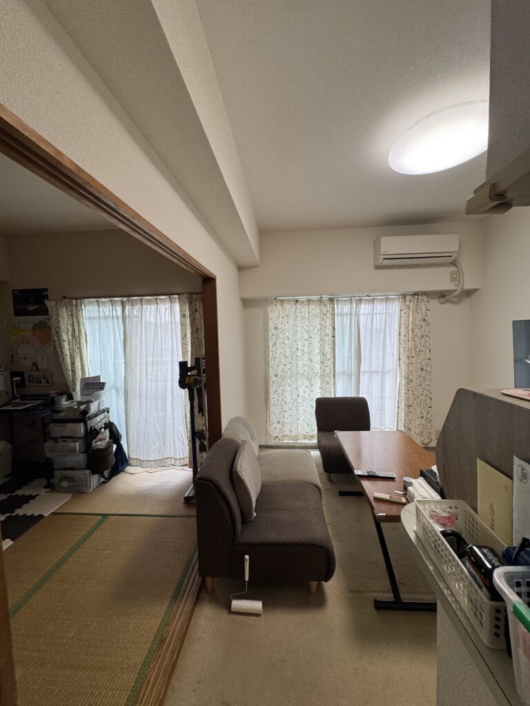大阪府岬町のマンションにお住まいの40代M様は7年前に中古マンションを購入しました。購入時のまま住んでいましたが、「昔ながらの細かく区切られた空間をもっと広くしたい」と思い、リフォームを計画されました。間取りはL型対面キッチンの横に8畳ほどの居間、隣には現在の規格での6畳と4.5畳の和室が二間続きであり、それぞれ襖で区切られていました。和室を洋室にし、費用は抑えつつもっと使いやすい空間にしたいとのご要望でした。